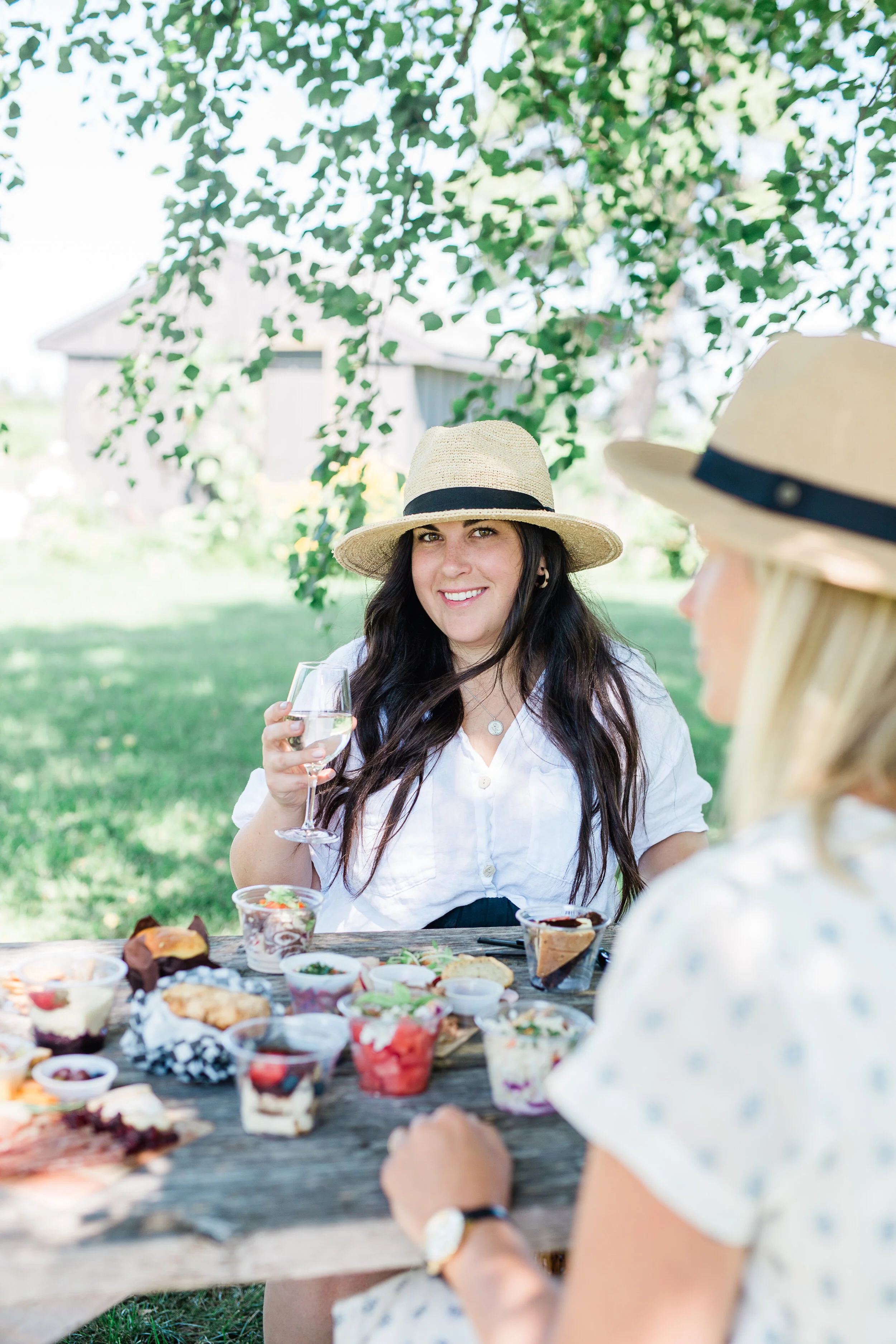 Our personal fave was the Vineyard Picnic as we are all about the cheese + charcuterie life. As you’ll see, we tasted + love all three and would guide you in the direction of any of the basket options. DEE-LISH! We also gotta give a shout out to Andrea from Georgian Hills who brought us some crisp + summery wines to pair with our baskets.
